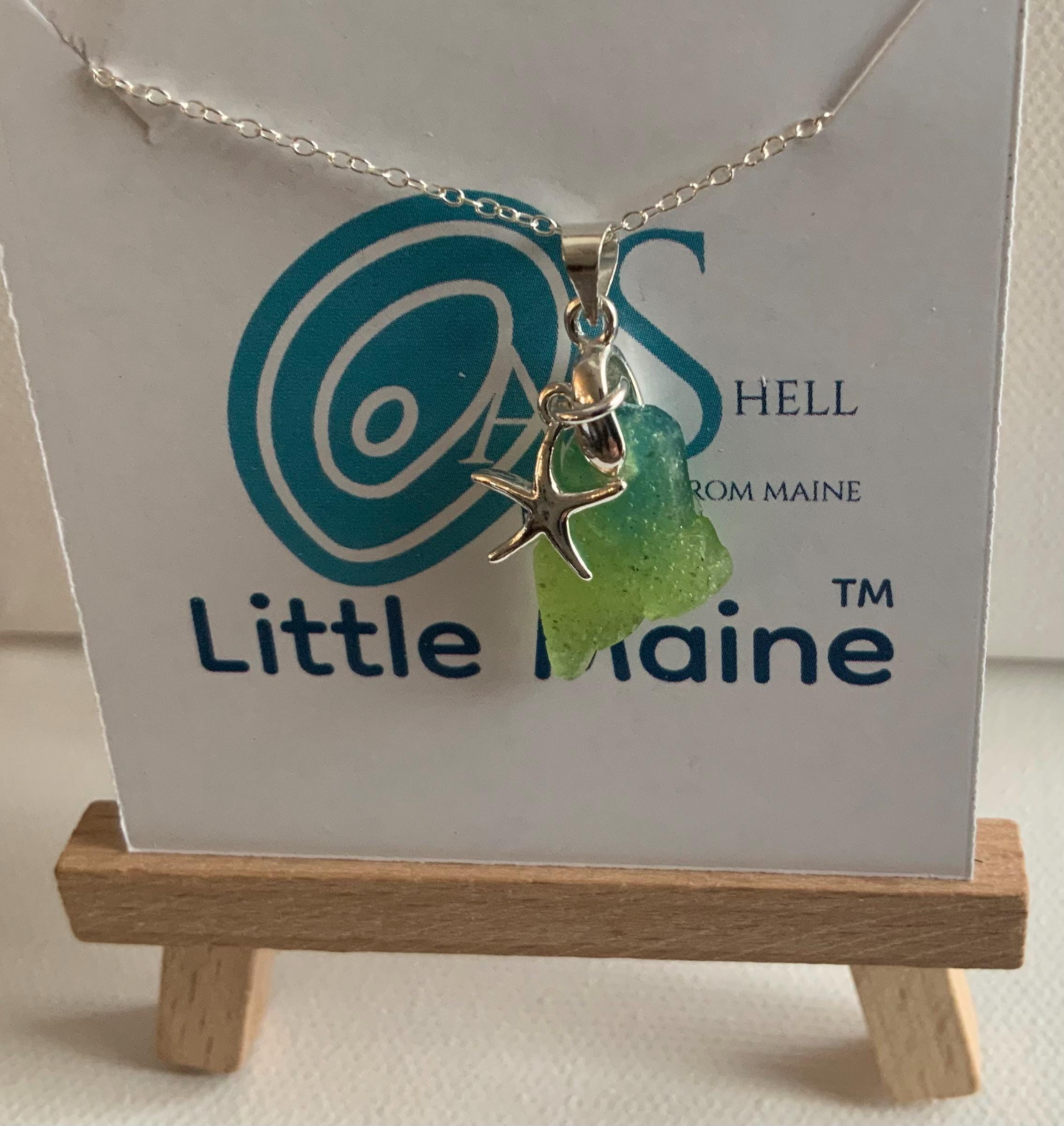 Green “Little Maine” Pendant with sterling silver starfish charm, 18” sterling chain. Crushed seaglass