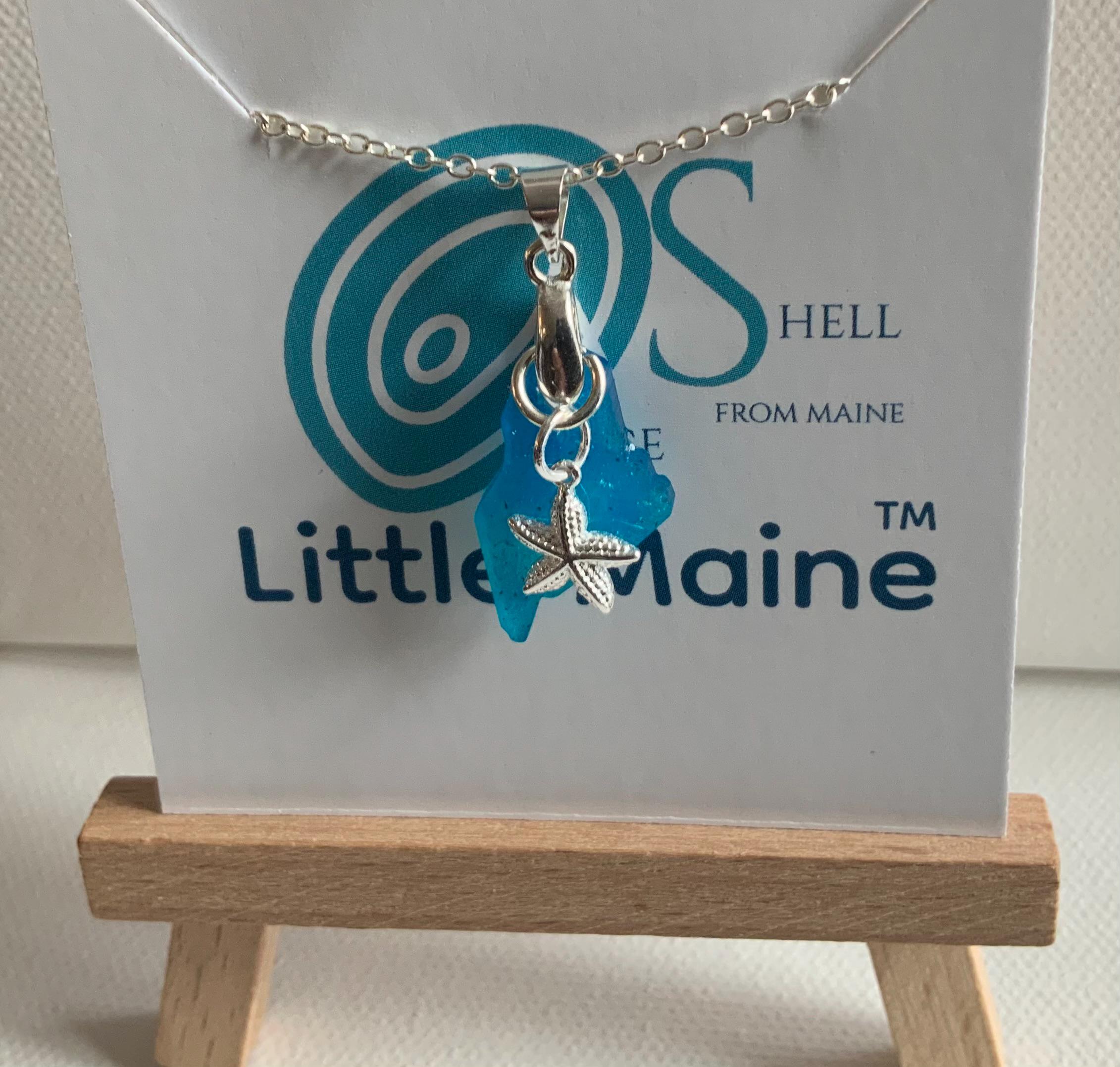 Teal “Little Maine” Pendant with sterling silver starfish charm, 18” sterling chain. Crushed seaglass