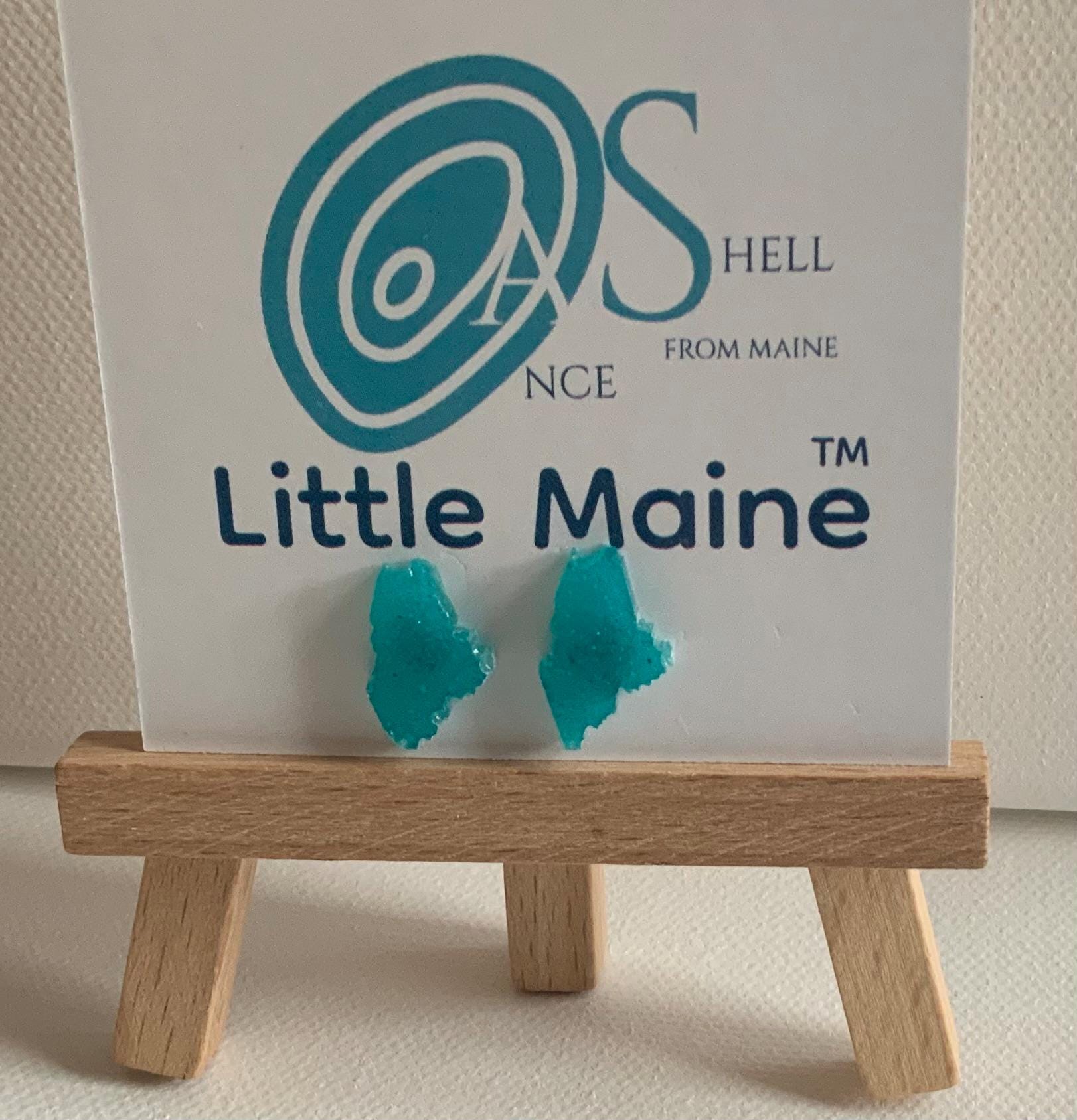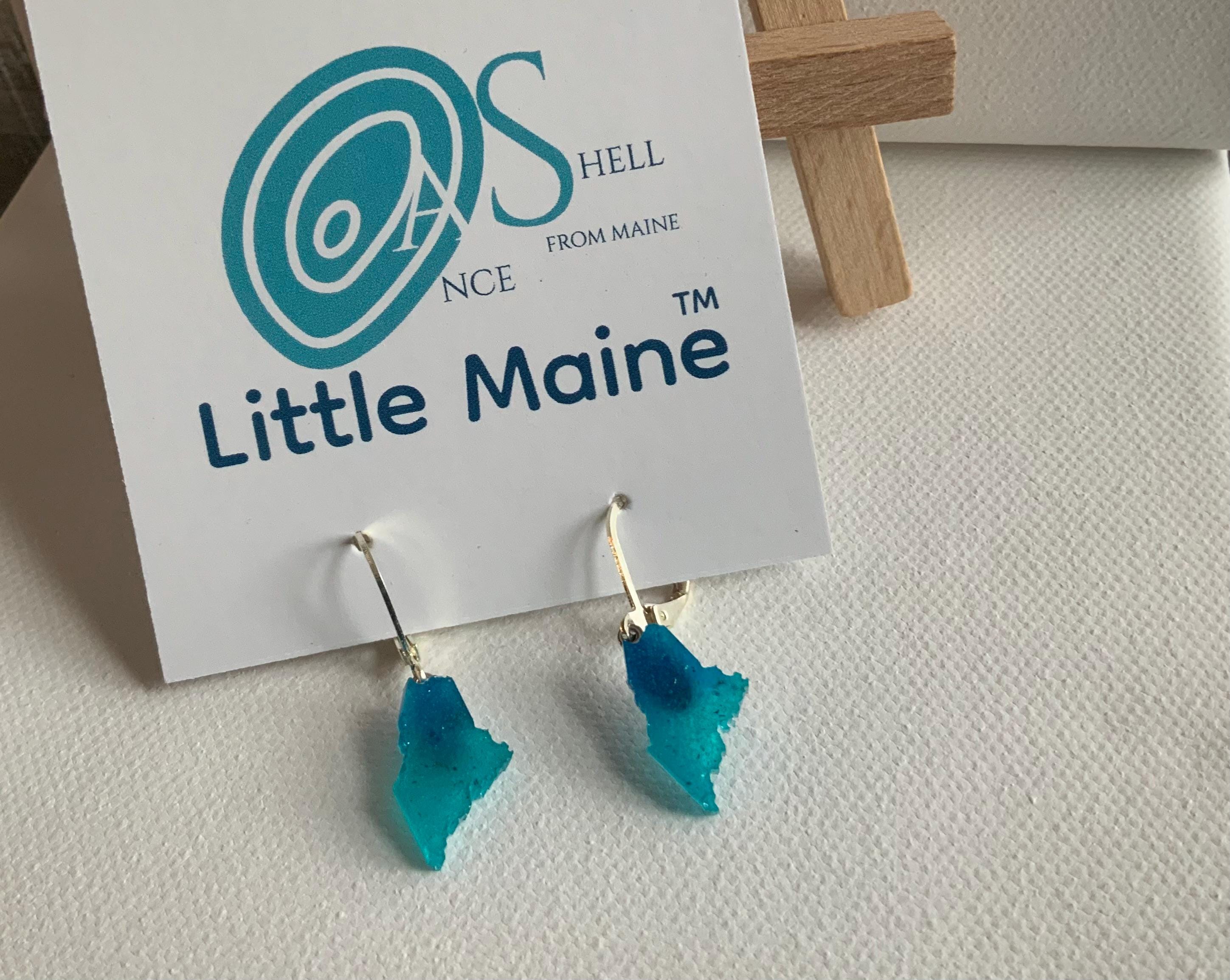 Teal “Little Maine” Pendant with sterling silver plated ear wire, lever back, nickel free. Crushed seaglass
