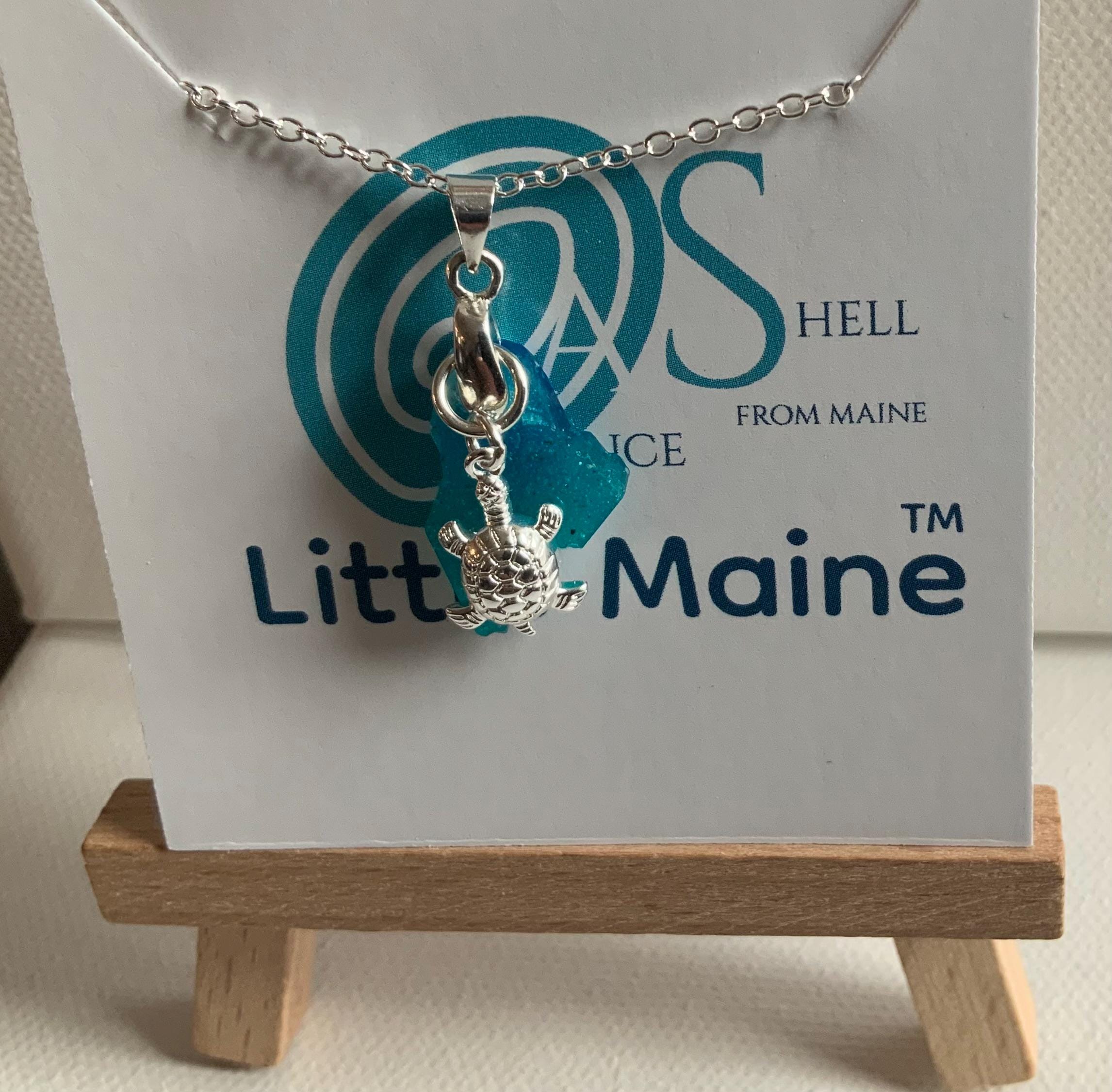 Teal “Little Maine Pendant with sterling silver turtle charm, 18” sterling chain. Crushed seaglass